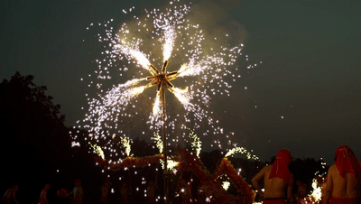龙王上台(铁花风火轮):“风火轮”旋转出的铁花,一层层、一圈圈,源源不断,赤膊的舞龙师傅们闪亮上台。